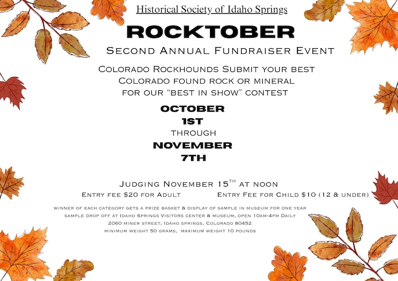 Come one come all for our Second Annual Rocktober Rock Hounding Fundraiser Event! Bring your favorite or best Colorado Found Rock or Mineral to Idaho Springs Visitors Center & Heritage Museum through November 7th to enter. Judging Day will be Saturday November 15th!