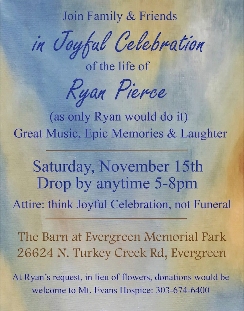 Ryan’s celebration of life will be this Saturday, open to all. Please do come join us in giving him a festive farewell.