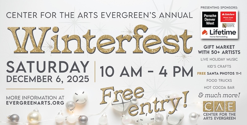 Center for the Arts Evergreen’s annual Winterfest artisan gift market and holiday festival is a FREE community event for all ages! Held at the Center with both indoor tables and outdoor tents, Winterfest is a celebration of our local artisanal talent and an opportunity to support Colorado artists and small businesses this holiday season. And there’s so much more to Winterfest than shopping! We’ll have the big man in red himself visiting with children, a kid’s (and kids at heart) holiday craft station, food trucks and a hot cocoa bar, and live holiday music throughout the day. You’ll also have the opportunity to view – and purchase from – our annual CAE member exhibition. We’ll even have complimentary gift wrapping to send you on your way with your treasures ready for their place under the tree!