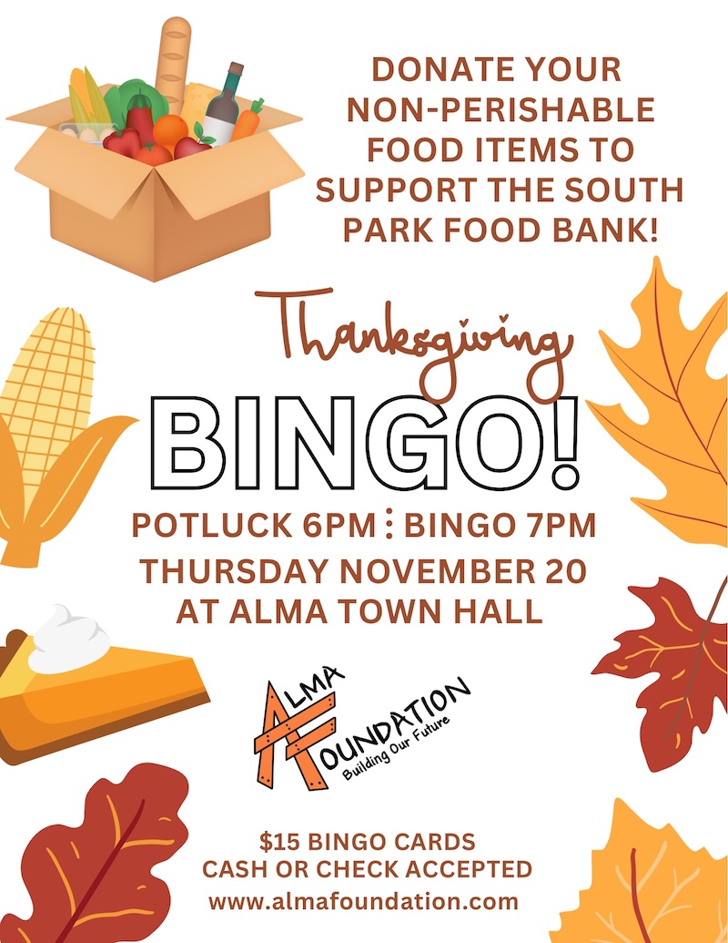 We will be accepting donations of non-perishable food items that will support the South Park Food Bank. Also bring an item to share at our potluck that begins an hour before Bingo begins.