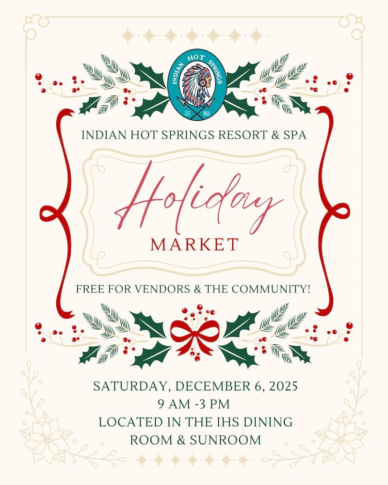 Join us for the First Annual Indian Hot Springs Holiday Market on Saturday, December 6 from 9:00 AM - 3:00 PM! If you're interested in vending, email us at This email address is being protected from spambots. You need JavaScript enabled to view it. for an application link! Limited vendor spaces remain!