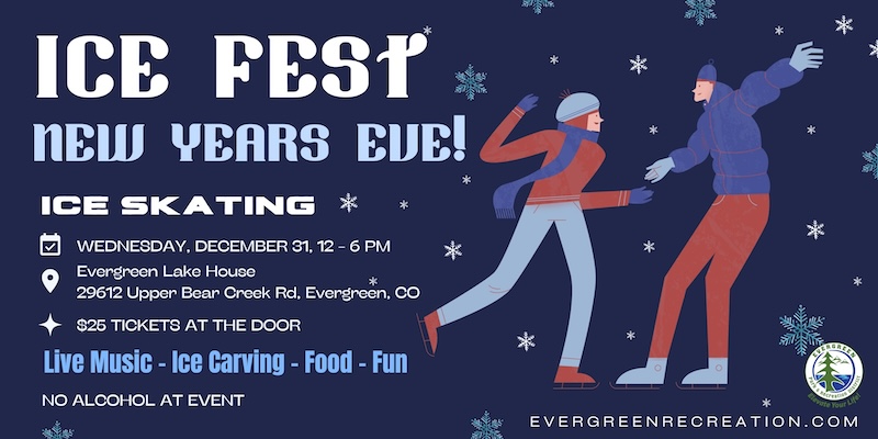 Celebrate the New Year with Evergreen Park & Rec District and the Evergreen community at EPRD’s Icefest! This magical daytime event will be held from 12:00 PM to 6:00 PM at Evergreen Lake and is open to all ages. Evergreen Lake is the largest outdoor Zamboni groomed ice skating rink in North America! The cost of tickets is $25 per person for ages 5 and up. Admission for children ages 4 and under is free. There will be food trucks onsite offering non-alcoholic beverages and food for purchase. Icefest tickets will be available for purchase on the day of the event on a first come, first serve basis.