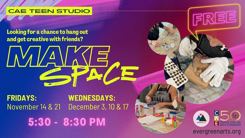 Come hang at MakeSpace: our new teen studio nights at Center for the Arts Evergreen! How you use the space is totally up to you: create art, listen to music, snack, or just relax and be social.