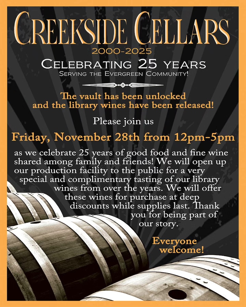 Creekside Cellars is celebrating 25 years! For a quarter century, we've shared great food, fine wine and incredible memories with our community. Join us Friday, November 28th as we celebrate 25 years of flavor, friendship and good cheer. Thank you for being part of our story. Cheers to the next 25!