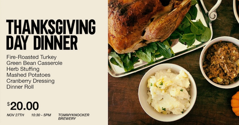 Join us on Thanksgiving day if you want a warm meal without the kitchen chaos. We’re serving our special fire-roasted turkey plate with green bean casserole, herb stuffing, mashed potatoes and gravy, cranberry dressing, and a dinner roll. It’s a full holiday spread for twenty bucks, and ten for kids.