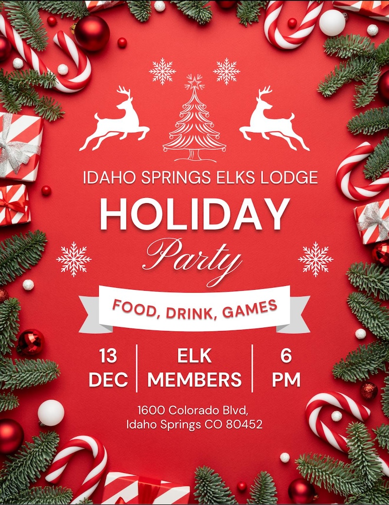 Attention Elk Lodge Members and Guests: Come celebrate at the Idaho Springs Elks Lodge on December 13th at 6pm. Enjoy an evening filled with a potluck dinner, drinks, raffle prizes and a charity blackjack game. All proceeds from the raffle will go towards renovating our Historic Elks Lodge, while funds from blackjack will be used for a charity chosen by Elk members. Let’s make it a fun and charitable evening at the Elks!