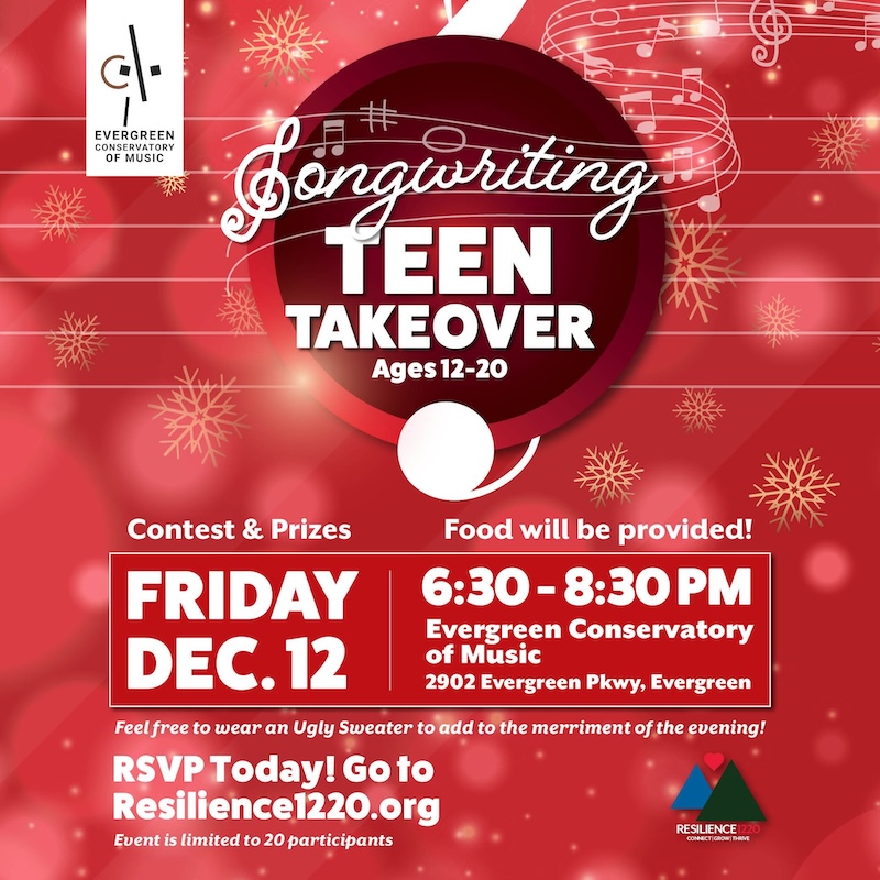 Join Resilience1220 at Evergreen Conservatory of Music for a Songwriting Teen Takeover on December 12th from 6:30-8:30pm. Food will be provided, wear an ugly sweater to add to the merriment of the evening!