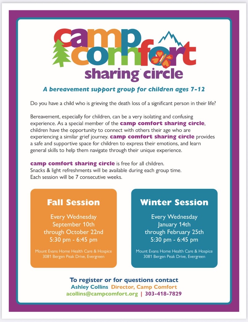 The Camp Comfort Sharing Circle is a free, weekly support group for kids ages 7-12, providing a valuable resource for any children and families who are grieving the death loss of an important person. Please reach out directly at This email address is being protected from spambots. You need JavaScript enabled to view it. or call at 303-418-7829 to register.