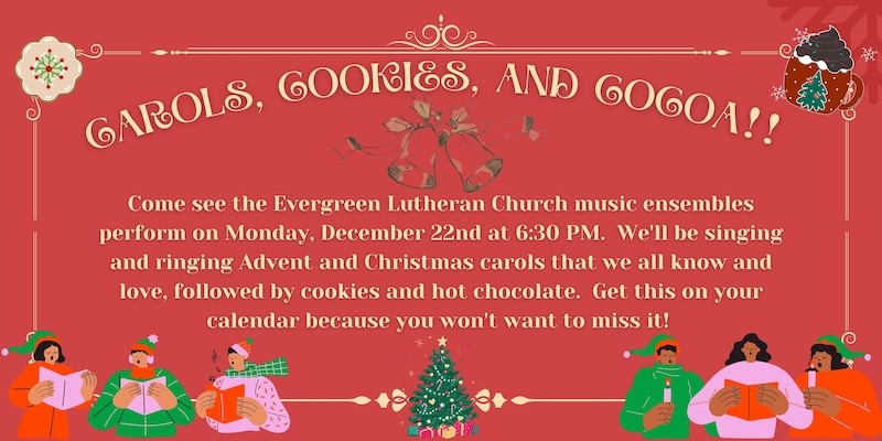 Evergreen Lutheran warmly invites you to our Christmas Concert, "Carols, Cookies, & Cocoa".