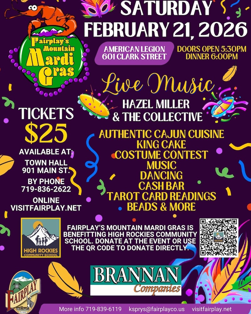 It's finally time for Fairplay's Mountain Mardi Gras!! Join the party on Saturday, February 21st! Tickets are on sale now either by phone, online or in-person for $25 per person. We'll be serving up authentic Cajun cuisine and live music from