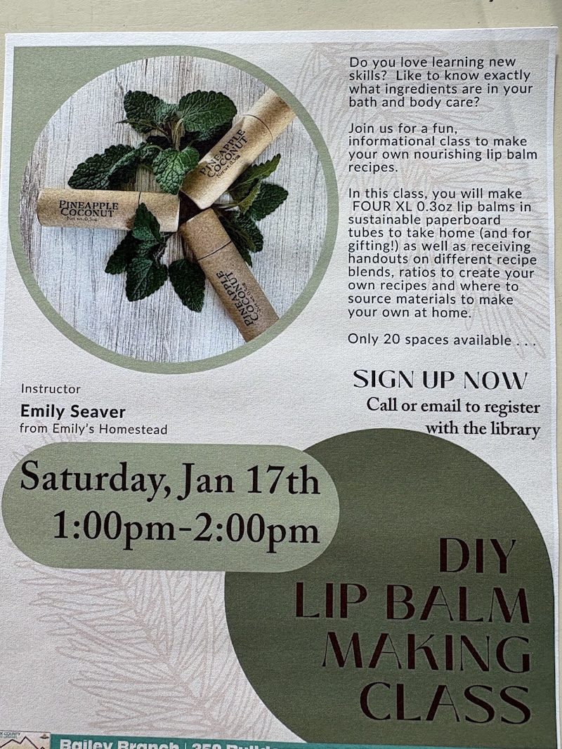 Do you love learning new skills? Like to know exactly what ingredients are in your bath and body care? Join us for a fun, informational class to make your own m=nourishing lip balm recipes. In this class, you will make four XL 0.3 oz lip balms in sustainable paperboard tubes to take home (and for gifting!) as well as receiving handouts on different recipe blends, ratios to create your own recipes and where to source materials to make your own at home. Only 20 spaces available. Registration is a must! Call the library at 303-838-5539 or emailĀ This email address is being protected from spambots. You need JavaScript enabled to view it..