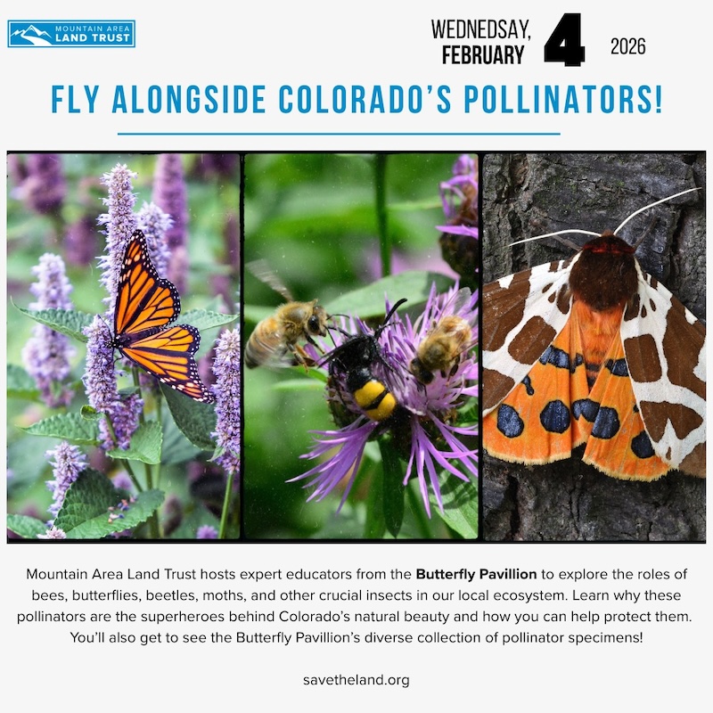 Mountain Area Land Trust's free, educational community events return next month as we host expert educators from the Butterfly Pavilion to explore the important roles bees, butterflies, beetles, moths, and other pollinators play in our local ecosystem.