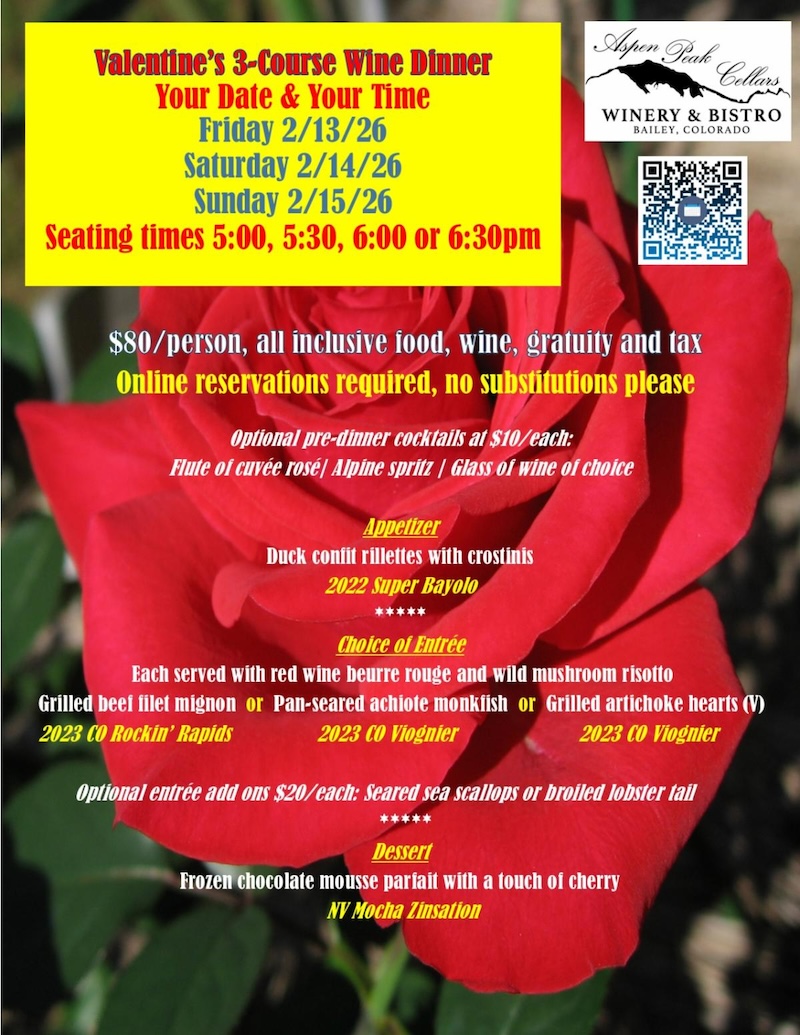 Valentine's 3-Course Dinner at Aspen Peak Cellars
