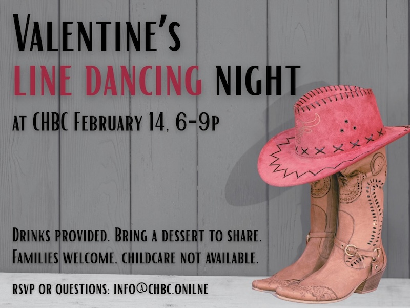 Grab your sweetheart or friend, boots and flannel shirt, and join us for a night of line dancing. On Feb. 14 from 6-9p, Mike & Linda Borrego will be leading us in an evening of boot-scootin' fun at the church. Drinks will be provided, please bring a dessert to share. This is a family-friendly event, and children must be accompanied by an adult.