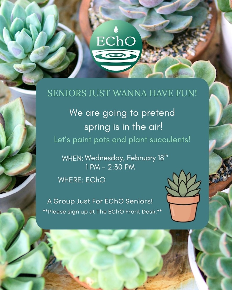 Seniors Just Wanna Have Fun (and get a little dirty)! Join us for a hands-on afternoon of creativity as we paint awesome flower pots and plant succulents. No worries if you’re not a painter — the flower pots will already have designs to paint, or you’re welcome to paint anything your heart dreams up!