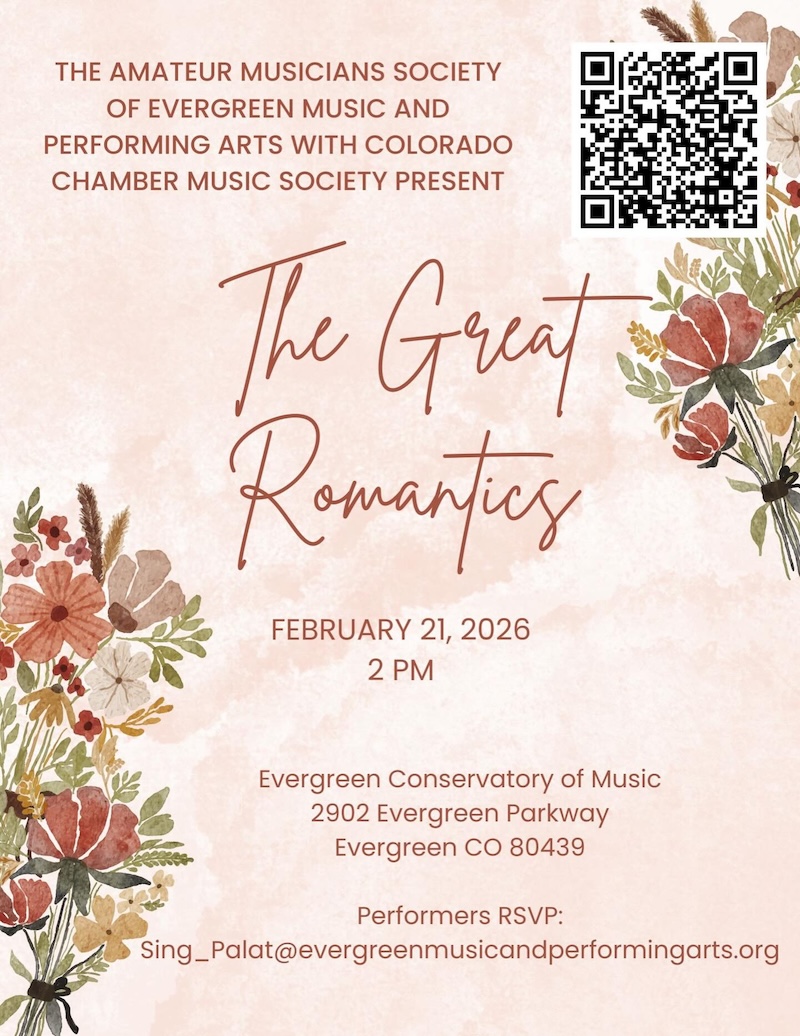 Feb 21 at 2 pm at Evergreen Conservatory of Music, 2902 Evergreen Pkwy, Evergreen CO.