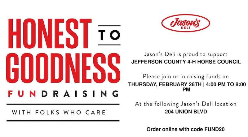 Looking for an easy (and delicious) way to support local 4-H youth? Stop by Jason’s Deli, where our 4-H Horse Council will be hosting a Fundraiser Night on Thursday, February 26th from 4:00–8:00pm!
