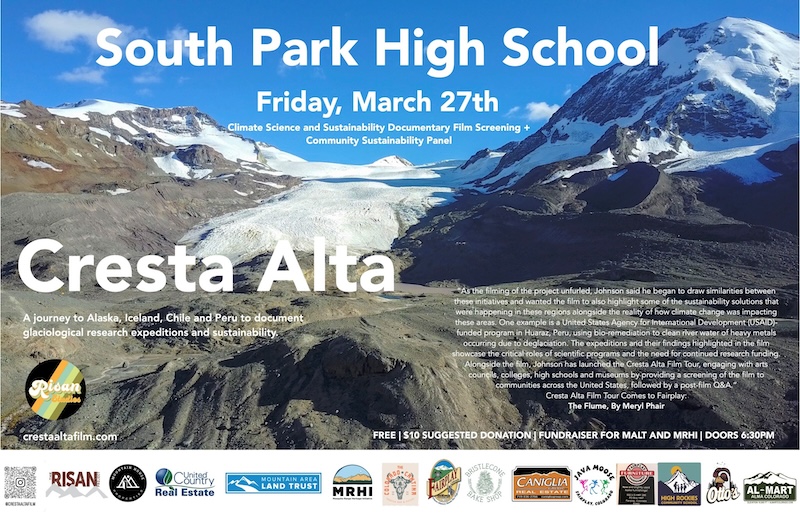 Todd Anders Johnson's film “Cresta Alta” documenting glaciological research projects in Alaska, Iceland, Chile and Peru will be showing in Fairplay at South Park High School on Friday, March 27th. Doors open at 6:30pm. Admission is FREE with a $10 suggested donation as a fundraiser for Mosquito Range Heritage Initiative and Mountain Area Land Trust.