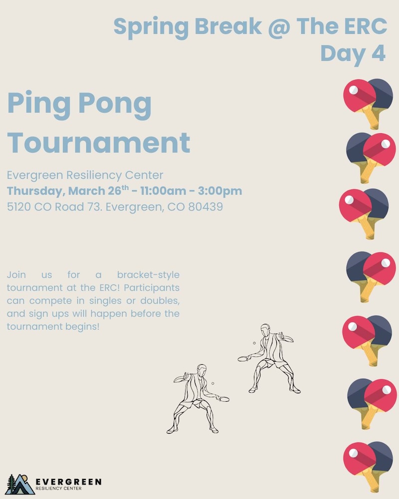 Thursday: Ping Pong Tournament - join us for a bracket=style tournament at the ERC. Participants can compete in singles or doubles, and sign ups will happen before the tournament begins.
