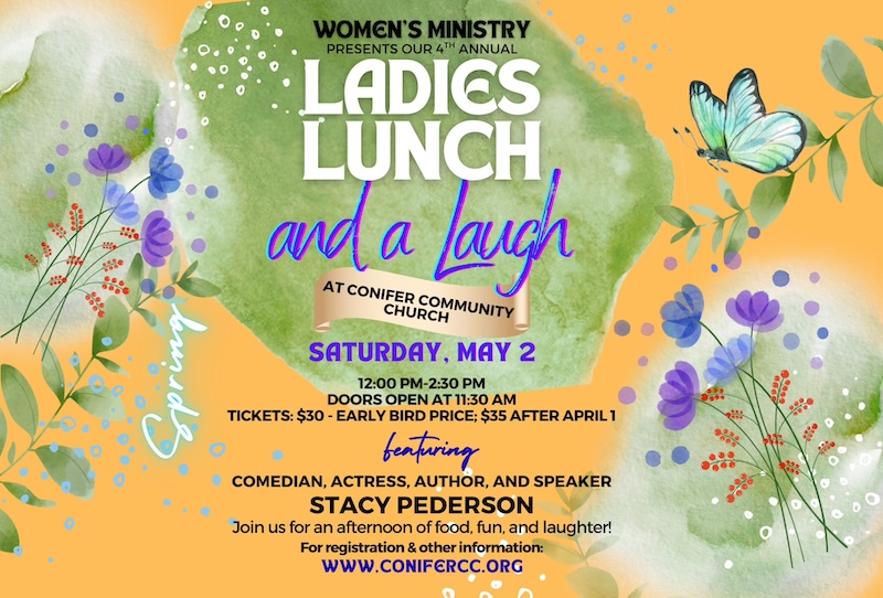 Conifer Community Church Women's Ministry is having our fourth annual Ladies, Lunch, and a Laugh! Spring Event. Come and invite your friends for a fun-filled time with good food, good fun, and lots of laughter!
