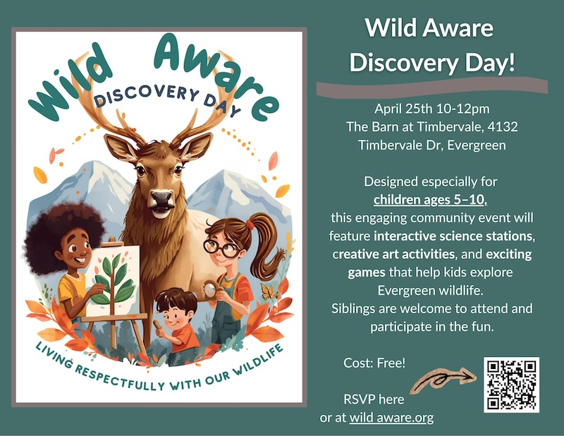 Wild animals and children! Two of our favorite things! Bring your children, ages 5-10, to the Barn at Timbervale centrally located in Evergreen, on April 25th for a fund morning of science. art, games! Please RSVP: This email address is being protected from spambots. You need JavaScript enabled to view it. or can QR code below.