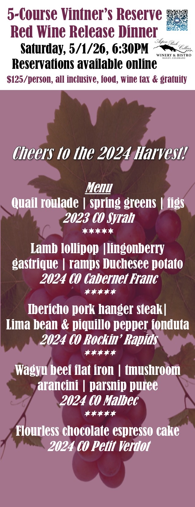 Any of those wines will be available to all attendees at 20% discount at the end of the night. All wines are created with 100% Colorado grapes. Please no substitutions. All ticket sales are final and non-refundable, but transferable to another party.