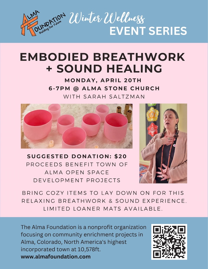 This event is part of a greater, Winter Wellness Event Series, which aims to bring community centeredness and accessible wellness opportunities during a season of cold weather and prolonged isolation. Suggested donation for this event is $20, where all proceeds benefit Town of Alma Open Space Projects.