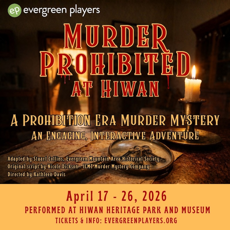 Evergreen Players and Hiwan History Museum are teaming up to offer an immersive, interactive mystery event within the former log home of Dr. Neosha Josepha Williams Douglas, built between 1893 and 1918 located on Meadow Drive in Evergreen. The museum transforms into the 1920’s home of former crime boss Victor Moretti, and the small audience, as “guests” for Moretti’s speakeasy party assist Detective Gunn in solving the ensuing crime. This offers a unique theatrical experience where actors will engage directly with audience members who become active participants in solving the crime.