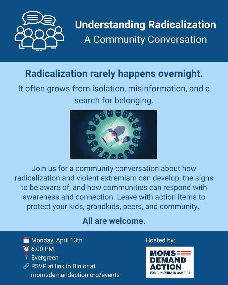Join neighbors and community members for an open, thoughtful discussion about how radicalization develops and how communities can respond with awareness, empathy, and connection. This gathering will explore common pathways to radicalization, early warning signs, and ways we can support healthy dialogue in our community. All are welcome to listen, learn, and participate in a constructive conversation.