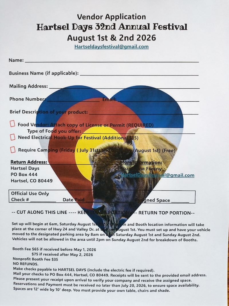 Here it is - the Hartsel Days 2026 Vendor Form!! Once again, we're offering an early bird special! Booth fee is ONLY $65 for both days if received before 5/1/26! After that date booth fee is $75 for both days. Come and join the fun!