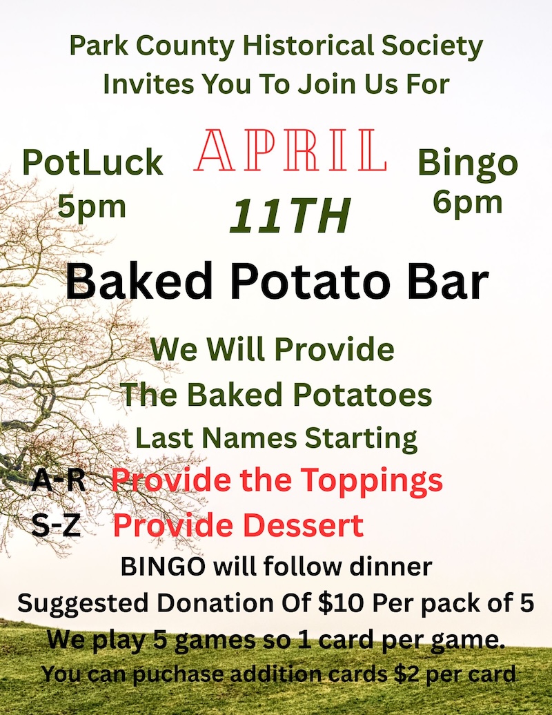 Hope you will join us as we gather together for an evening of fun and friendship all while helping to raise funds for the Park County Historical Society. We meet in the Heritage Center located on the EAST side of McGraw Memorial Park.