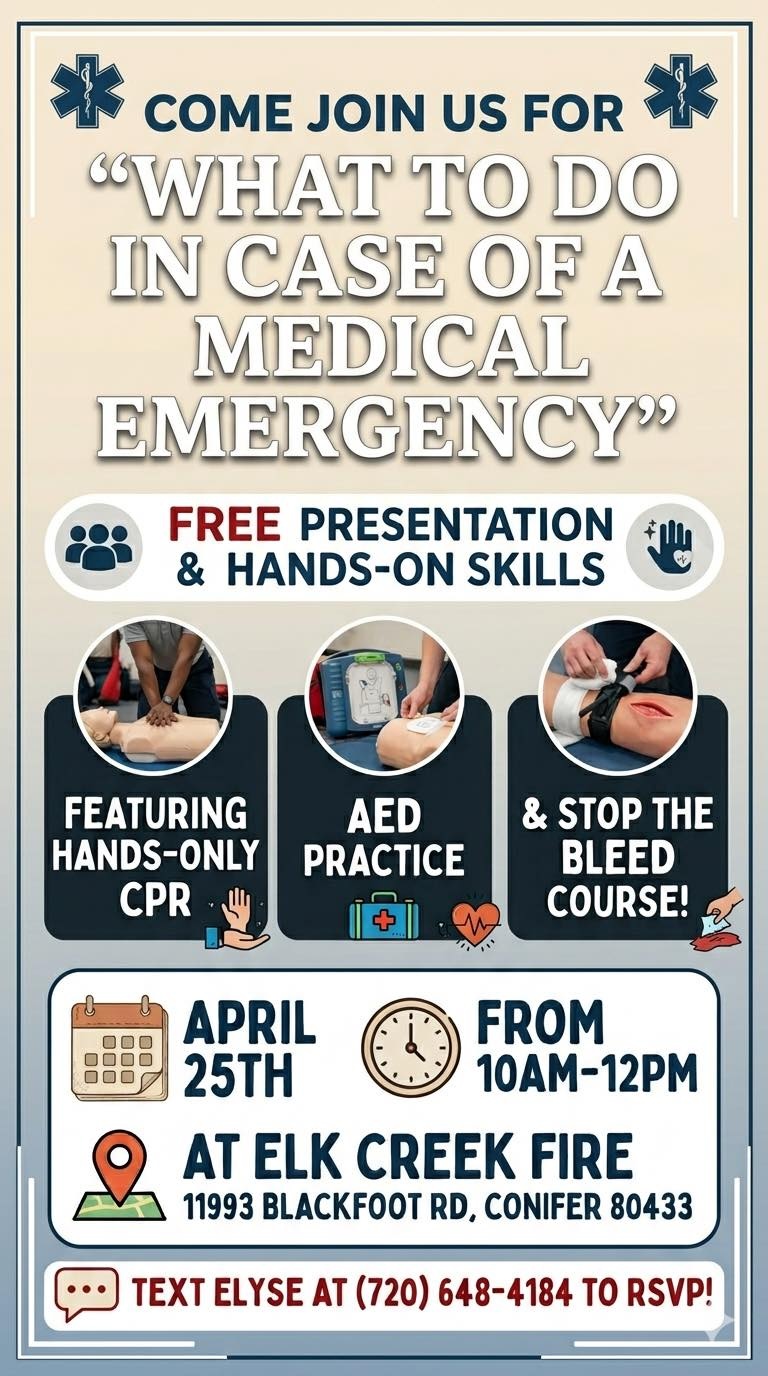 Your local ER nurses are teaming together to teach Stop the Bleed and other skills to make sure you are equipped to handle a medical emergency! Free to attend this Saturday, April 25th from 10-noon at Elk Creek Fire Station. This is our community service project. Thank you for your support!