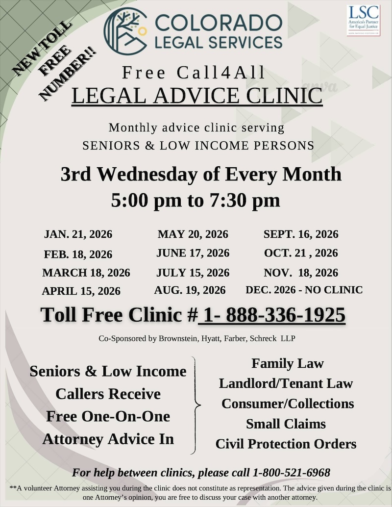 Colorado Legal Services' free monthly Call4All legal advice clinics are held the 3rd Wednesdays of the month from 5 - 7:30 p.m. Call 1-844-404-7400 from 5 to 7:30 p.m. if you are a senior or to see if you qualify as low-income to talk one-on-one with an attorney.