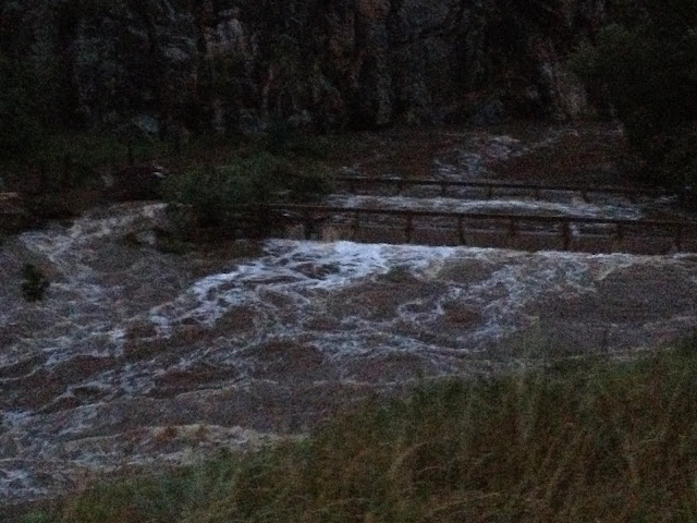 This photo was taken at Cold Springs Gulch Road which is just east of Kittredge on Highway 74. It was shot at 7:25 PM this evening (9/15) The picture shows the severity of the current conditions. The river is flowing swift and high and more rain is coming. Please plan ahead and be prepared should conditions further develop.