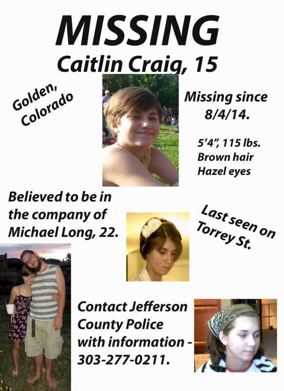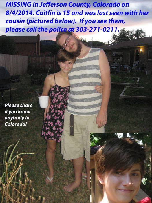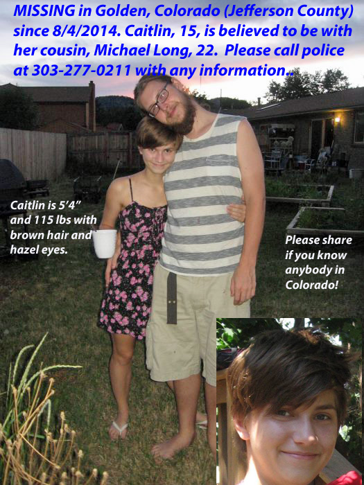 MISSING: Caitlin Craig, 15. Caitlin is from Charlottesville, Virginia and was visiting relatives in Golden, Colorado. She has been missing since 8/4/14 and is believed to be with her cousin, Michael Long, 22. We believe that she is not in a safe situation. If you have friends in the Jefferson County area, please share this with them. Virginia family members are also trying to raise money to get to Colorado to assist with the investigation -