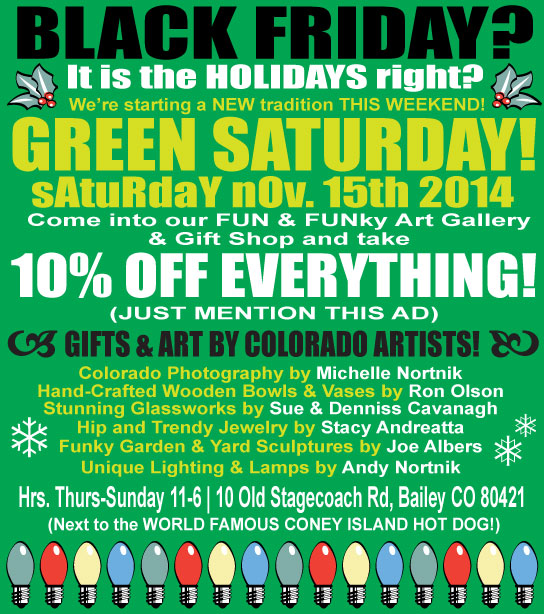 BLACK FRIDAYS? It is the Holidays right! Visit us tomorrow at our FUN & FUNky ART GALLERY & GIFT SHOP for your holiday shopping! Get it done early and spend BLACK FRIDAY with your family! We're located in Bailey, right next to the WORLD FAMOUS CONEY ISLAND HOT DOG on Hwy 285 just past Moore Lumber.