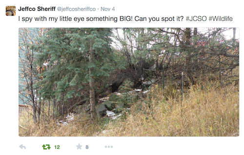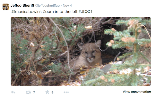 Though they are always among us, we just don't always see them; it behooves us to remain vigilant with a reminder every now and then. There have been a couple of reports of dogs having been snatched recently in Conifer and Evergreen and this beauty ran across Hwy 74 between Evergreen and Kittredge 2 days go. Photo courtesy of Ted Wheeler.