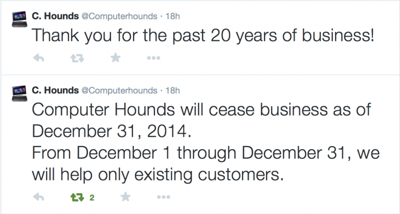 Computer Hounds is closing at the end of the year after 20 years in business. I wish Pierre the best of success in his new endeavors and am thankful for all the years of computer service he provided for our community members.