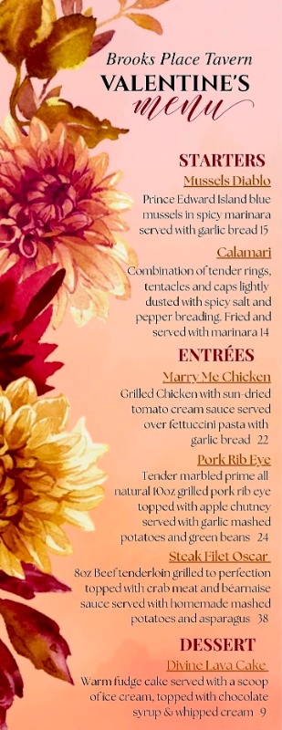 Valentine's Day starts tonight February 13th at Brooks Place Tavern!! Specials start at 4pm & start again at noon tomorrow! Live music with David Frisk starts at 1pm, Saturday, February 14th.