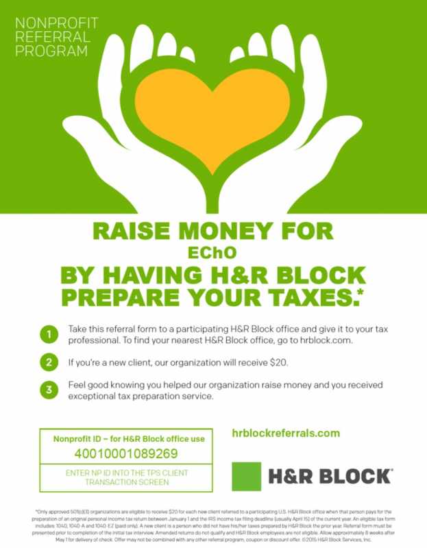 Evergreen Christian Outreach (EChO) is partnering with H&R Block this tax season! Get a referral code from the link below and take it to the office when you have your tax return prepared. If you are a new H&R Block client, we will get a $20 contribution.