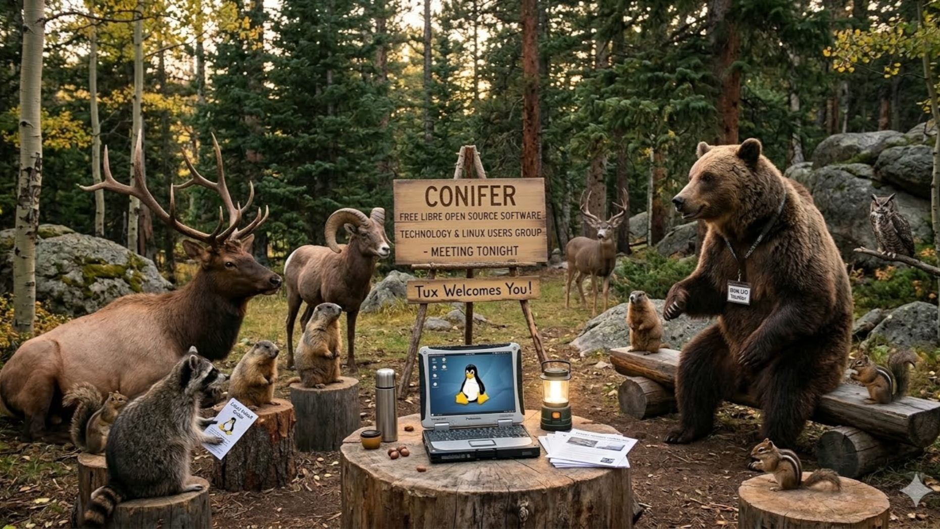 at the Conifer Library. This will be our third meeting, so if you're an old hand or a newbie, a professional or hobbiest, or just curious about this "Linux" thing, please come and share your time with us. We're an open group centered around using and promoting Free / Libre Open Source Software and Hardware, and the Linux operating system.