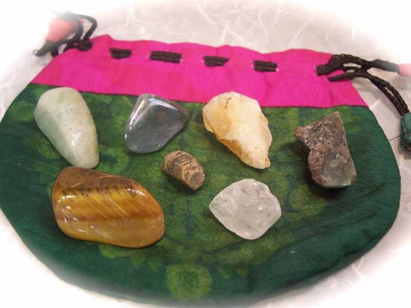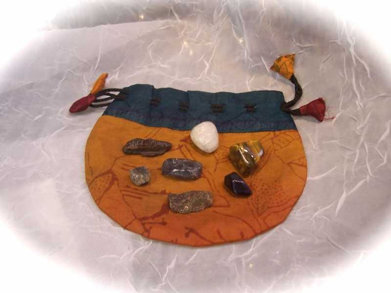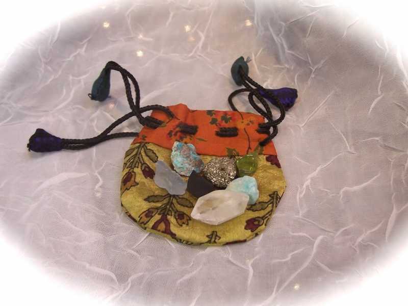 Energy Meditation Pouch: This wonderful Mediation Pouch contains 7 natural stones (some natural crystals, tumbles, or rough): Quart, Pink Opal, Kunzite, Azurite, Turquoise, Spirit Quartz and Ametrine. All of these stones help in settling into a good easy meditative state. It contains 7 stones as this is a magical number and the number of heaven. The hand made silk pouch that the stones come in is Fair-Trade from Nepal and measures approx. 4" x 4 1/2" Perfect as a gift for yourself or someone close to you! All pouches come with a list of stones included in the pouch and do not include quarter (tis for sizing).