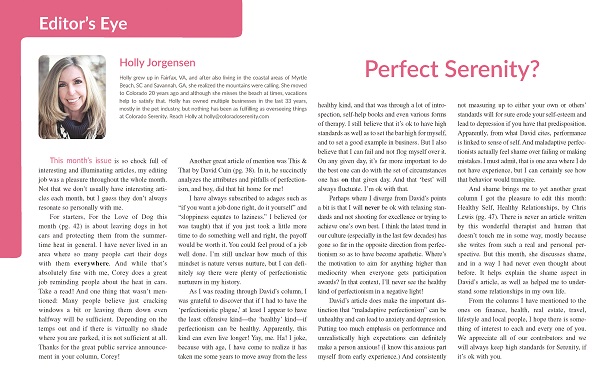 Another great article of mention was This & That by David Cuin (pg. 38). In it, he succinctly analyzes the attributes and pitfalls of perfectionism, and boy, did that hit home for me!