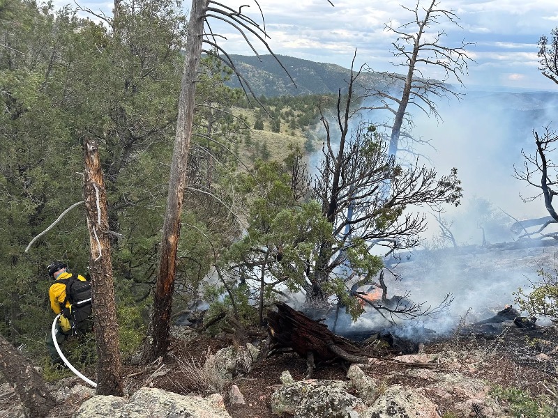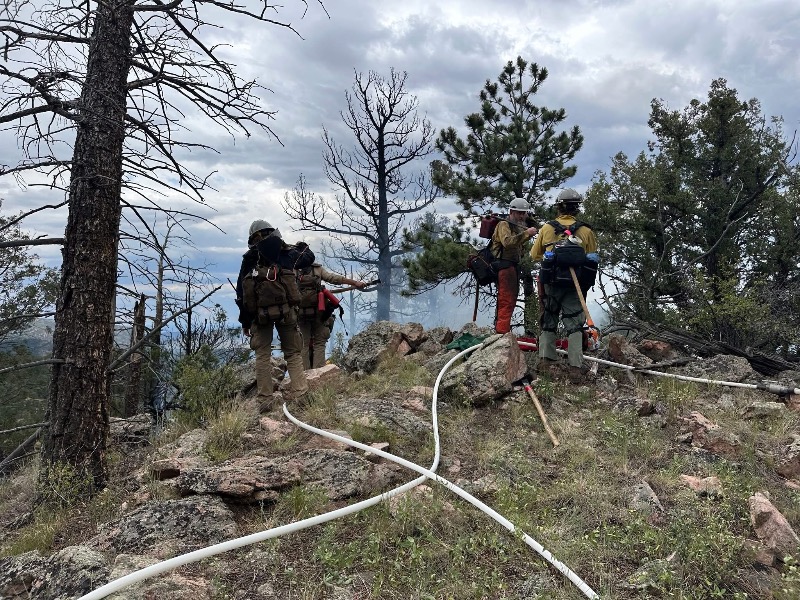 Jeffco Sheriff: Douglas County Sheriff's Office helicopter dropped off members of their helitack team on the side of the mountain for direct attack. In addition to JCSO, Elk Creek Fire Department, Douglas County Sheriff's Office, Conifer FD, Jeffco Open Space, CO are working together to extinguish the fire.