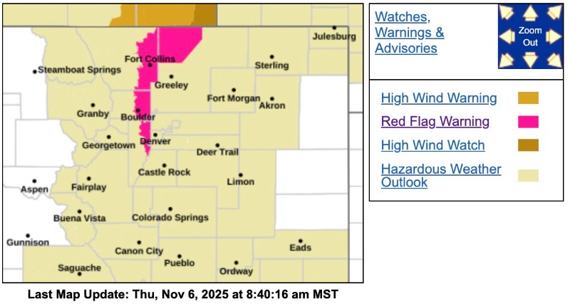 The National Weather Service in Denver has issued a Red Flag Warning for wind and low relative humidity, which is in effect until 5 PM MST this afternoon.