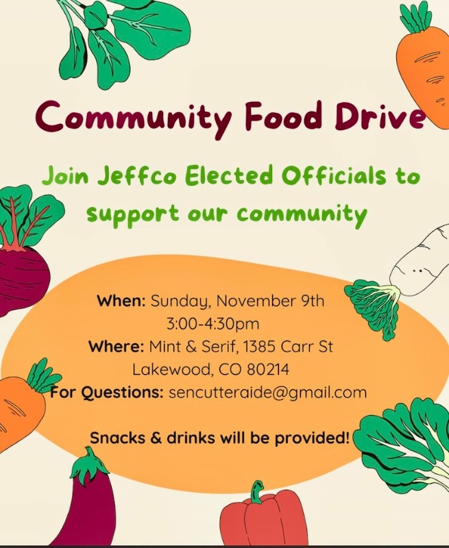 Jeffco elected officials are working to organize a community food drive, date and location to be determined (after the meeting, it was announced it would be held on November 9th from 3-4:30pm at Mint & Serif, 1385 Carr St, Lakewood).