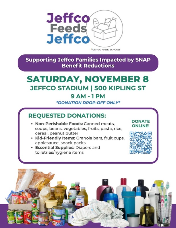 Jeffco Public Schools hosting a community food drive Saturday November 8th from 9am-1pm at Jeffco Stadium.