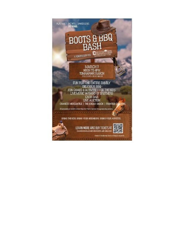 The Chances Scholarship Fund Boots & BBQ Bash is just 2 weeks away! Great food, Great music, a Great time for kids AND a all for a Great cause! Saturday March 7th from 12-4 pm at Tomahawk Ranch in Bailey. Get your tickets now and join us for a Great time!