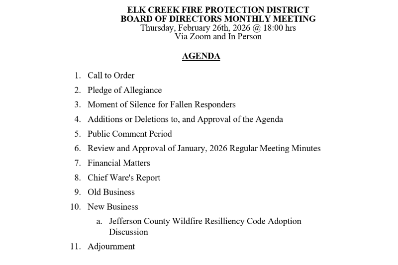 The public is invited and encouraged to attend the monthly regular Board of Directors meeting that will be held Thursday, February 26th starting at 1800 hours (6:00PM). You may attend in person at Station 1, 11993 Blackfoot Rd, Conifer, or online via Zoom. The Board packet can be found on our Meeting Minutes and Agendas page: