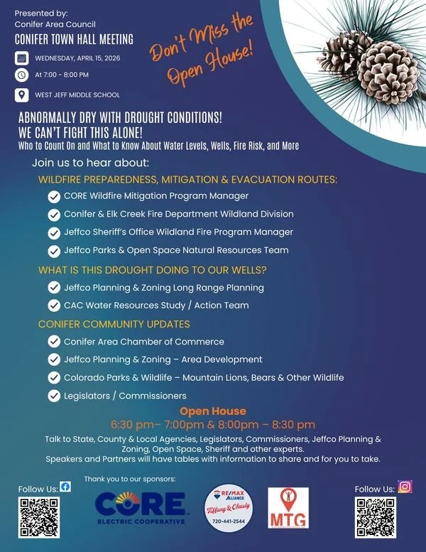 Wednesday, April 15th (Tax Day!) Find out what's going on in the Conifer Area! Topics include: Wildfire Evacuation routes, preparedness and mitigation. Jeffco Planning & Zoning info., Parks & Open Space (do you have questions about the dog park/playground?). YOUR legislators and Commissioners will be there. Open House before and after!